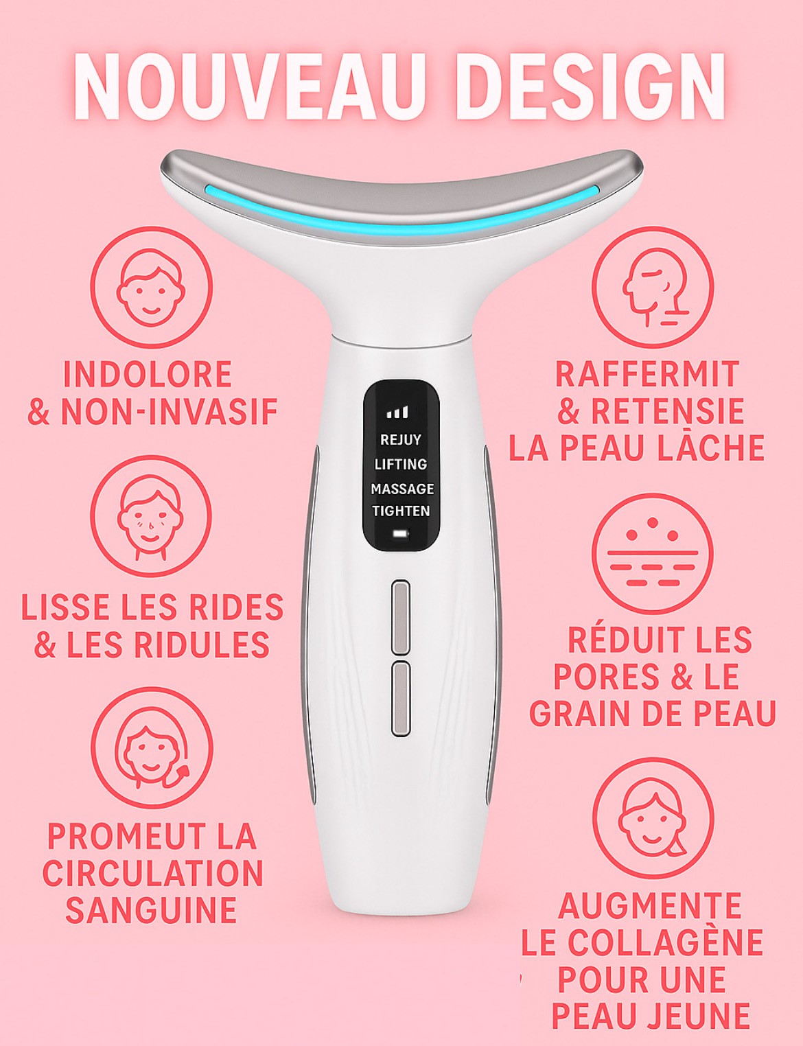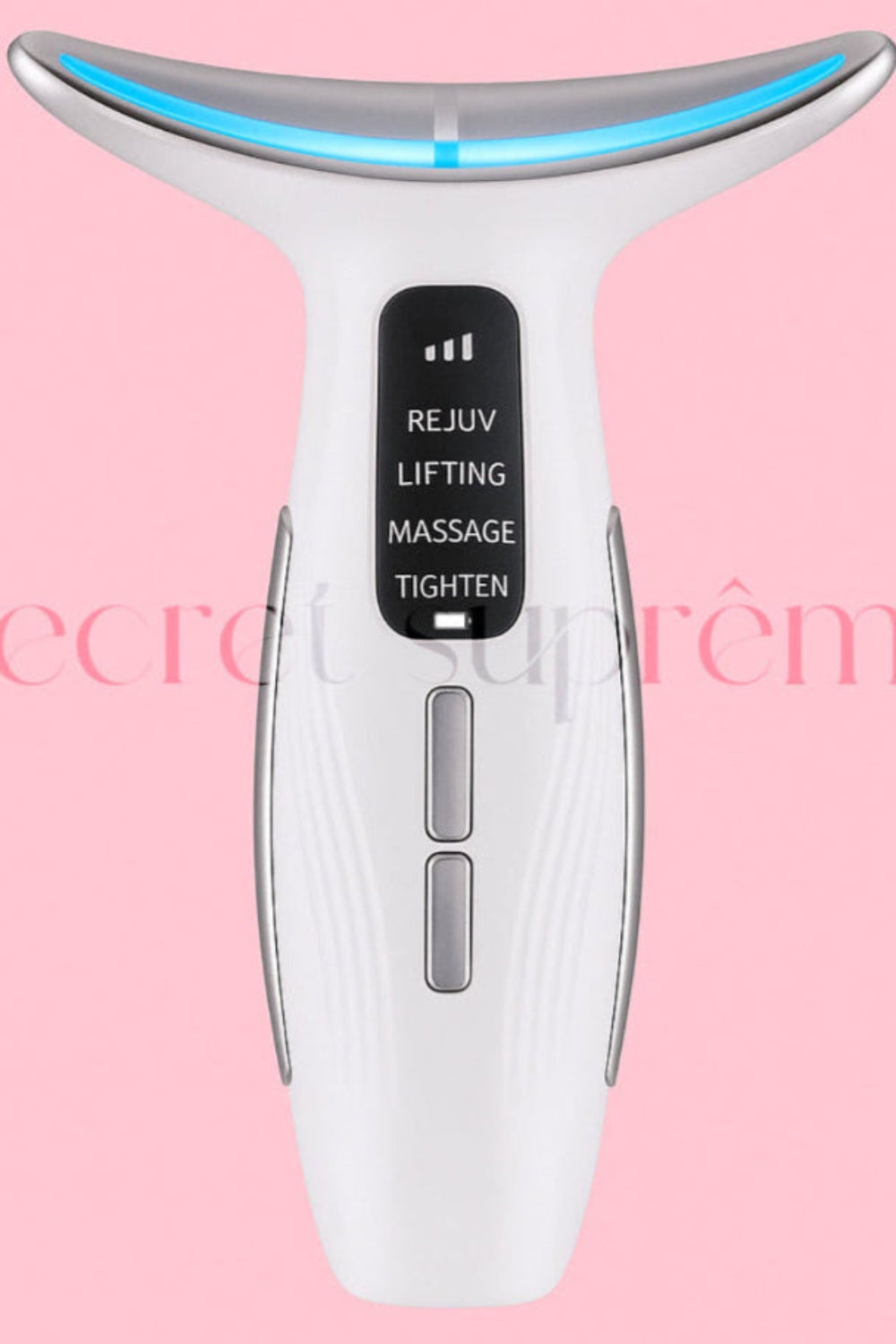 L’appareil Lift EMS combine chaleur continue à 45°C, lumières LED (bleu, rouge, violet, blanc) et technologie EMS (stimulation musculaire électrique) pour lifter, raffermir et rajeunir la peau du visage et du cou.